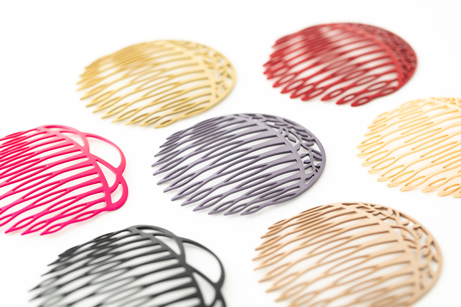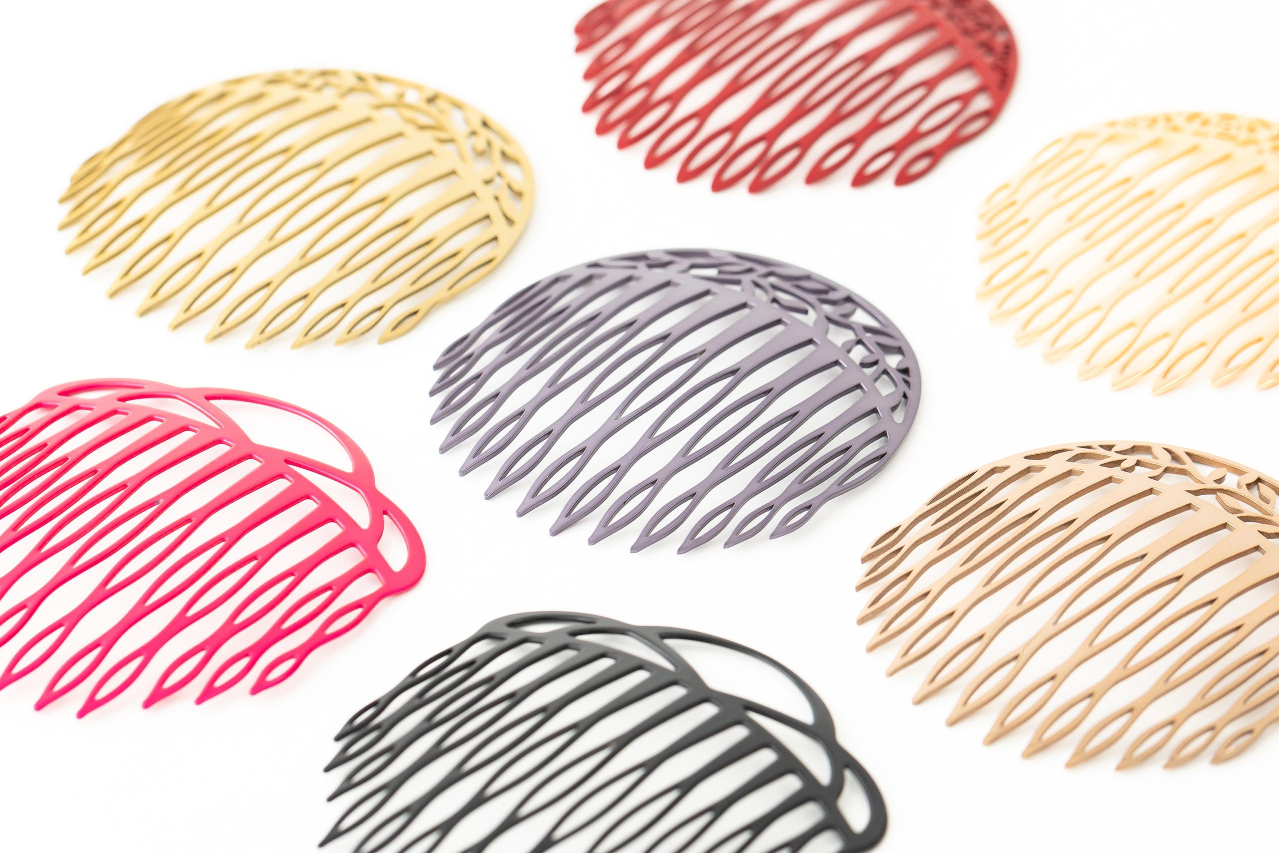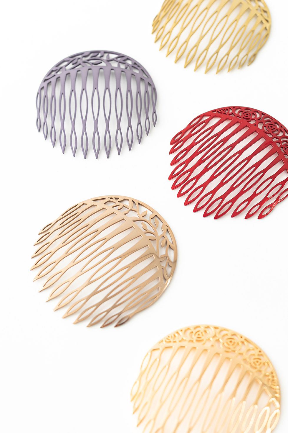 そうです。レースのように繊細なボタニカルモチーフをあしらった背の部分のデザインが印象的なコームで、もともとは弊社が「スワロフスキーで装飾したり多色展開するのではなく、マルチカラー塗装して一色展開したい」とオーダーしたのがきっかけでした。