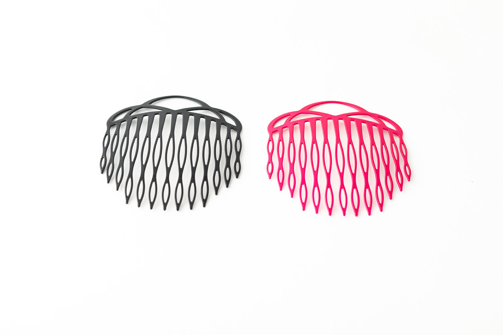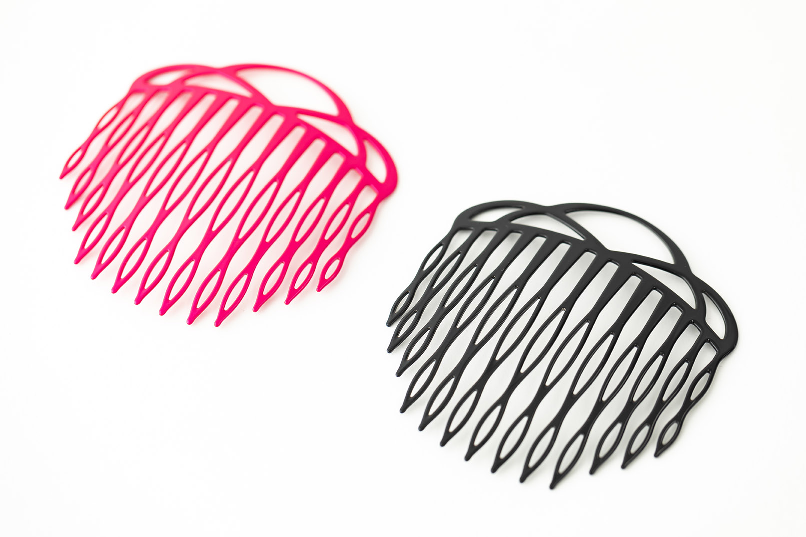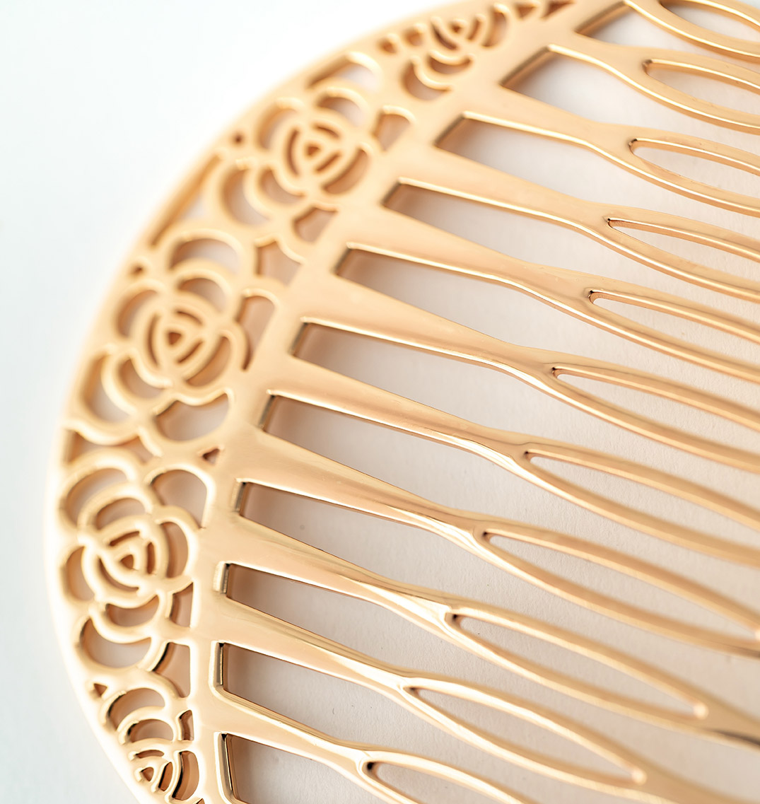 そうです。レースのように繊細なボタニカルモチーフをあしらった背の部分のデザインが印象的なコームで、もともとは弊社が「スワロフスキーで装飾したり多色展開するのではなく、マルチカラー塗装して一色展開したい」とオーダーしたのがきっかけでした。