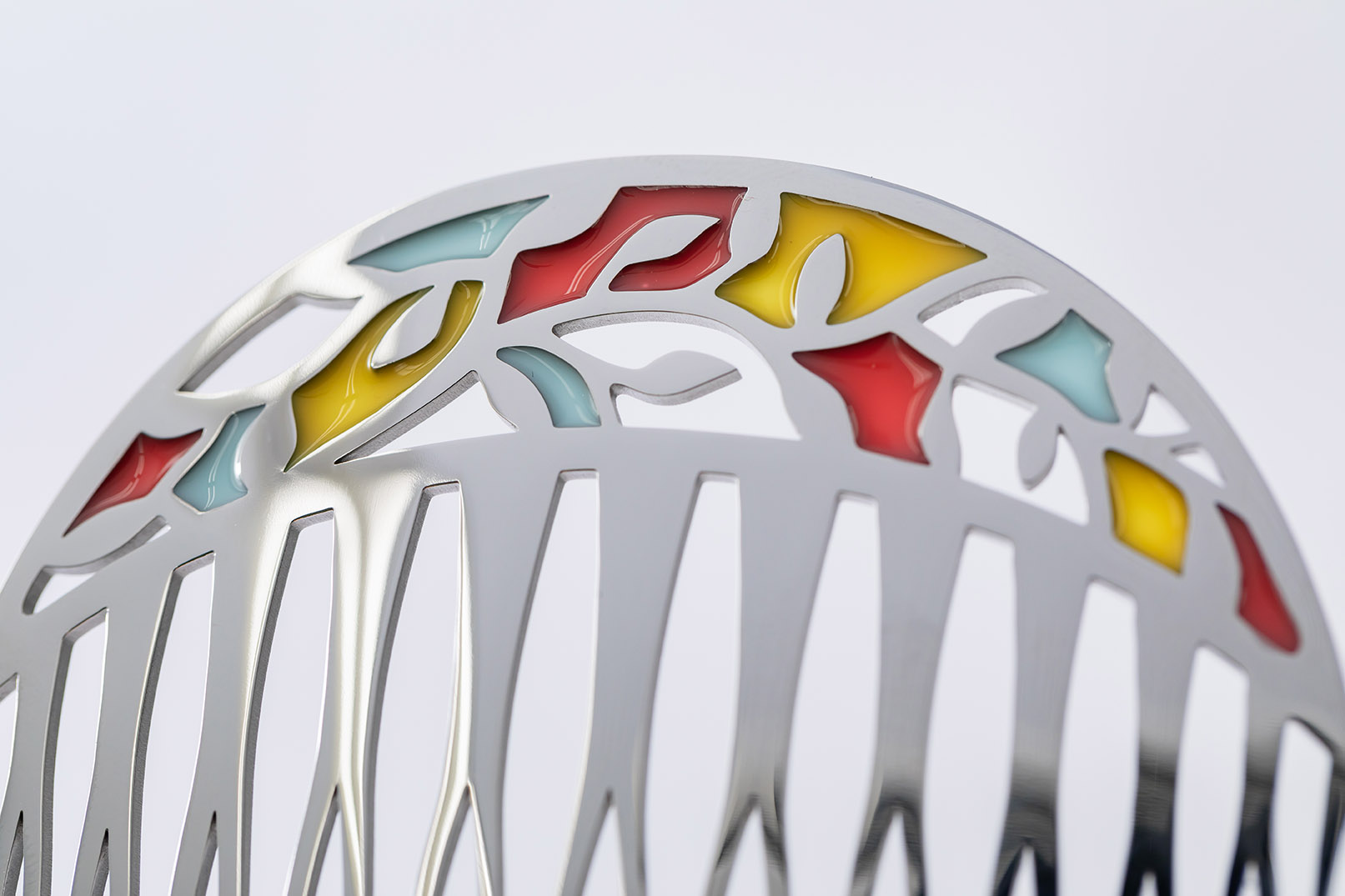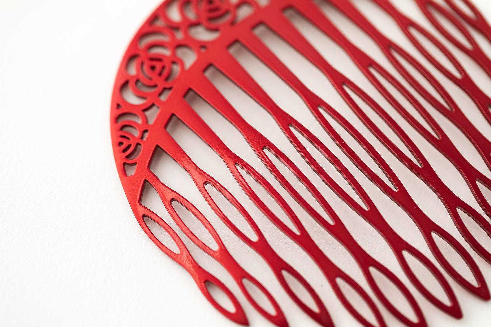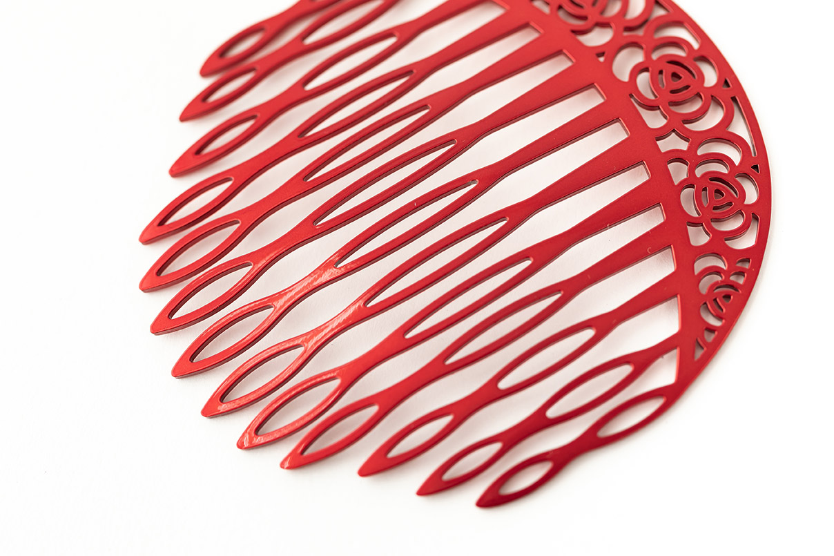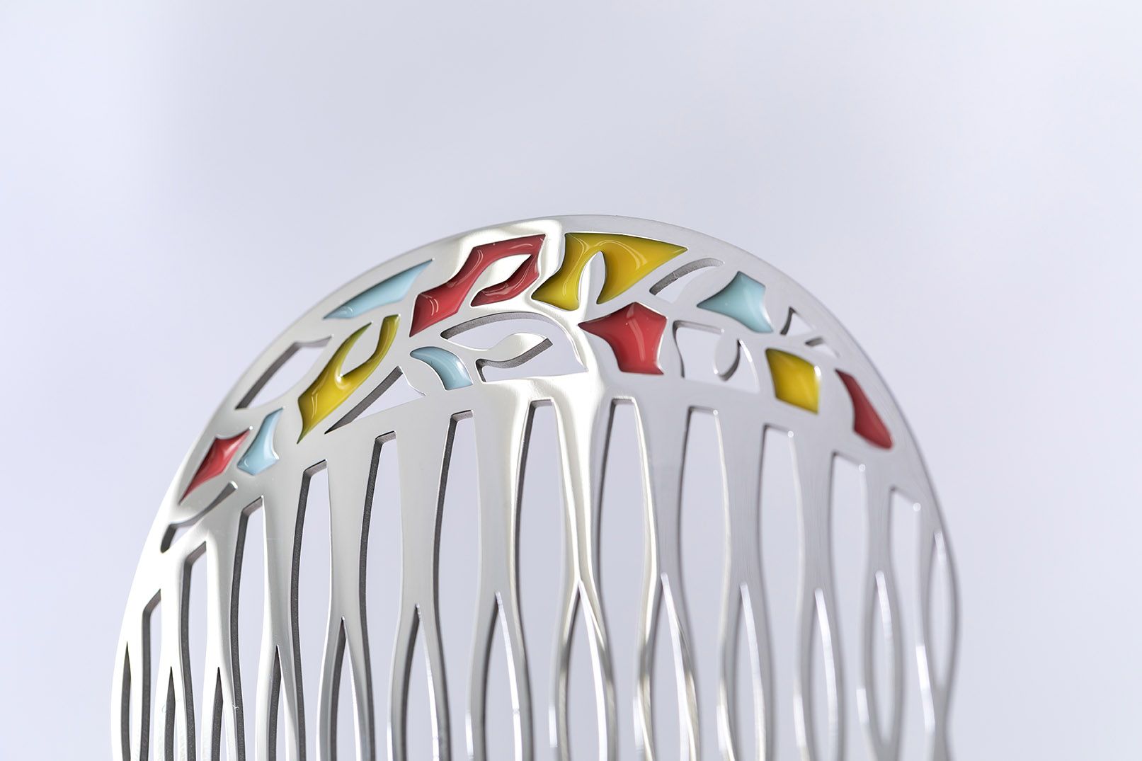 ぜひやってみたいと試作品の制作をお願いしたのですが、色を半透明にすると髪に挿したときに黒ずんで見えてしまうことがわかりました。それが理由で最終的には不透明な色で塗装していただいたのですが、実際に「ステンドグラスのようなデザインのコーム」として商品化され、おかげさまでとても好評でした。